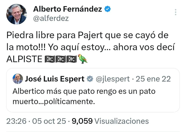 Fernández, siempre activo en redes, no dejó pasar la oportunidad para recordarle viejas disputas mediáticas. En tono sarcástico, replicó un antiguo mensaje del libertario -de los tiempos en que lo apodaba “Pajert”- y escribió: “Piedra libre para Pajert que se cayó de la moto!!! Yo aquí estoy… ahora vos decí ALPISTE”. La publicación tuvo miles de interacciones en pocos minutos y volvió a encender el debate político virtual.