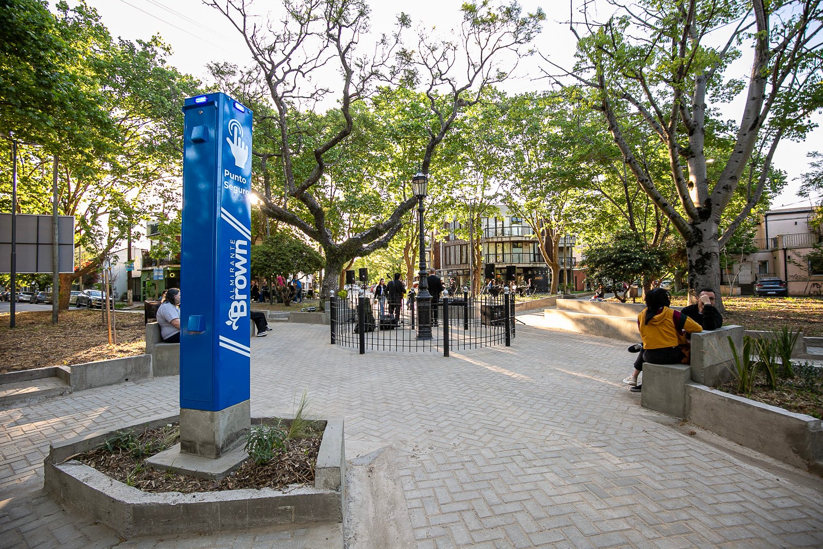 Además, se construyeron veredas con bloques de intertrabado y se instaló nueva iluminación con tecnología LED, tanto en columnas como alrededor de los plenos elevados. Otras de las mejoras tuvieron que ver con la conservación de la farola original de la plaza, la conformación de canteros que marcan los accesos y la instalación de un tótem de seguridad.