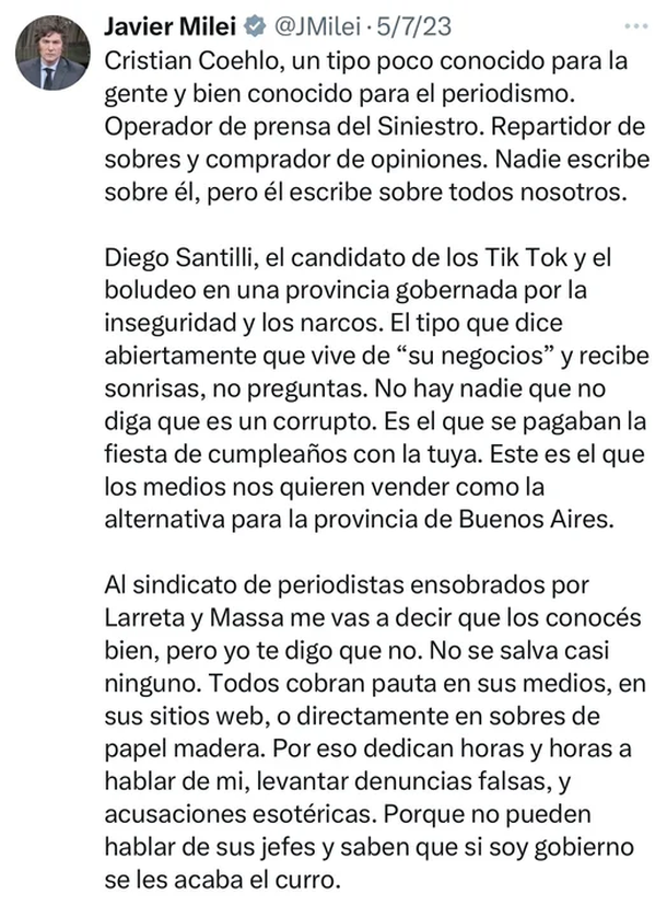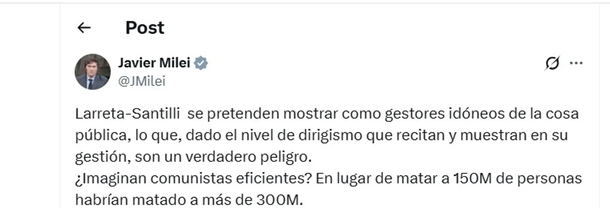 “Larreta-Santilli se pretenden mostrar como gestores idóneos de la cosa pública, lo que, dado el nivel de dirigismo que recitan y muestran en su gestión, son un verdadero peligro. ¿Imaginan comunistas eficientes? En lugar de matar a 150M de personas habrían matado a más de 300M”, sostuvo Milei en otra publicación.