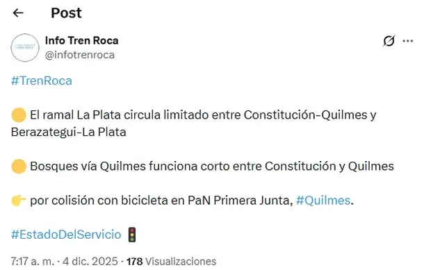 SOCIEDAD Dos ramales del Tren Roca funcionan con servicio corto por un accidente con un ciclista Editorial 4 de diciembre de 20254 de diciembre de 2025 Los servicios afectados son los de La Plata y Bosques por un incidente en el paso a nivel de Primera Junta.