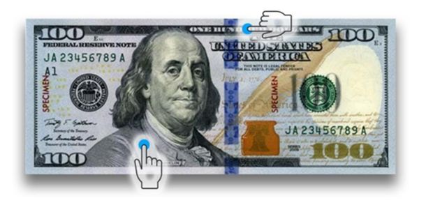 • Verifique la impresión calcográfica en el retrato, animal o símbolo principal. Debe sentirse en relieve al pasar los dedos.