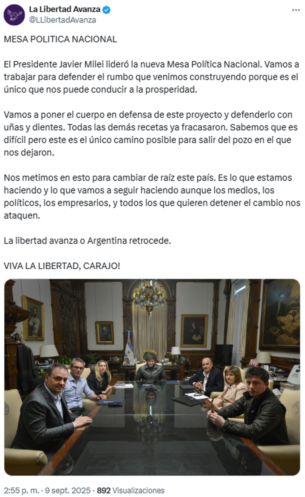El anuncio de esta iniciativa libertaria fue dado por Manuel Adorni, quien escribió en X: “El Presidente de la Nación tomó la decisión de conformar una mesa política nacional. La misma será presidida por él y estará conformada por: Karina Milei, Guillermo Francos, Patricia Bullrich, Santiago Caputo, Martín Menem y yo”.
