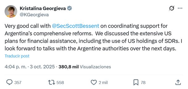 “Excelente conversación con Scott Bessent sobre la coordinación del apoyo a las reformas integrales de la Argentina. Conversamos sobre los amplios planes de asistencia financiera de EEUU, incluyendo el uso de las tenencias estadounidenses de DEG”, indicó la directora general del FMI en redes sociales.