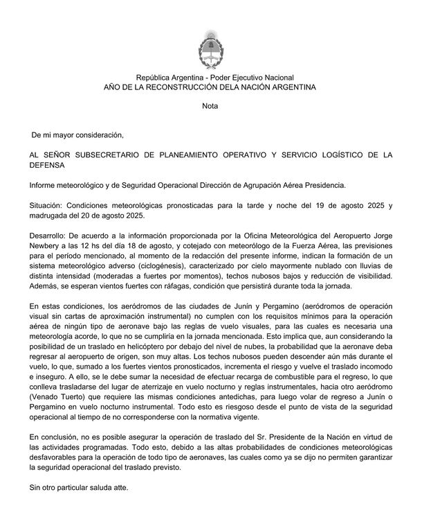 Agregó la OP que “esto se debe a la situación climática que se espera en esta zona del país, provocada por una ciclogénesis que generará lluvias abundantes y ráfagas de viento superiores a 55 km/h”, y apuntó: “Según el organismo de custodia del Presidente, el traslado tanto por vía aérea como terrestre resulta imposible bajo estas condiciones”.