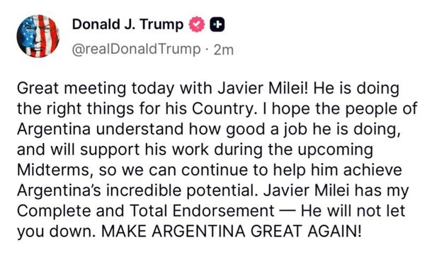 El presidente de los Estados Unidos, Donald Trump, publicó un mensaje en su red social Truth Social en el que brindó un contundente respaldo a Javier Milei, tras las declaraciones poco feliz durante la reunión bilateral donde condicionaba el apoyo económico al resultados de las elecciones legislativas.