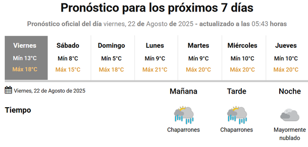 El domingo tendría condiciones del tiempo similares, con las primeras horas con cielo despejado, tornándose algo nublado desde la tarde. En este caso, el termómetro oscilará entre una baja mínima de 4 grados, subiendo hasta 17