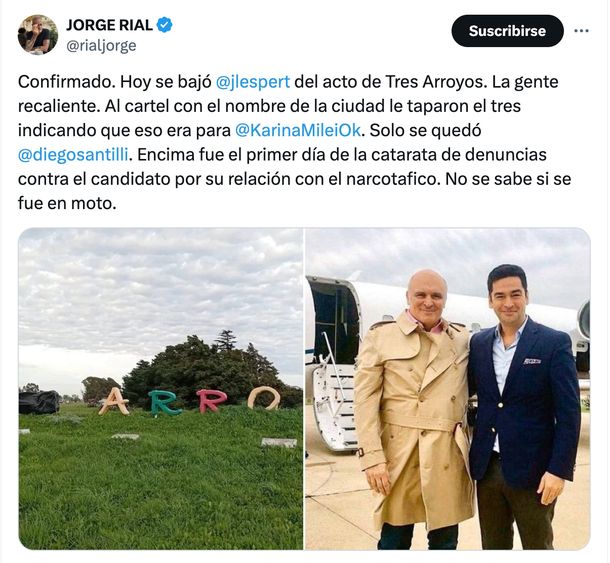 “La gente recaliente. Al cartel con el nombre de la ciudad le taparon el tres indicando que eso era para Karina Mile. Solo se quedó Diego Santilli. Encima fue el primer día de la catarata de denuncias contra el candidato por su relación con el narcotafico. No se sabe si se fue en moto”, sostuvo Rial en sus redes sociales.