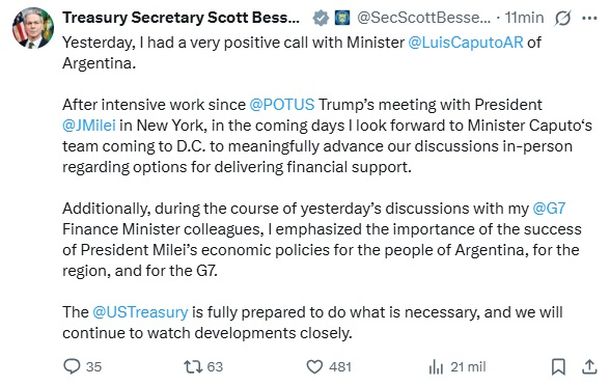 Caputo compartió el mensaje de Bessent y agregó: “Trabajando duro para terminar de concretar lo anunciado la semana pasada por el Secretario del Tesoro”.