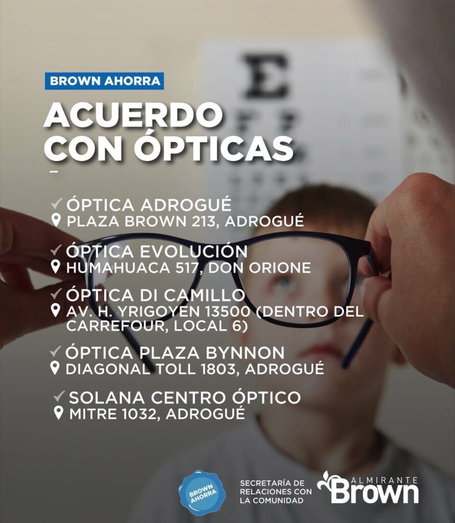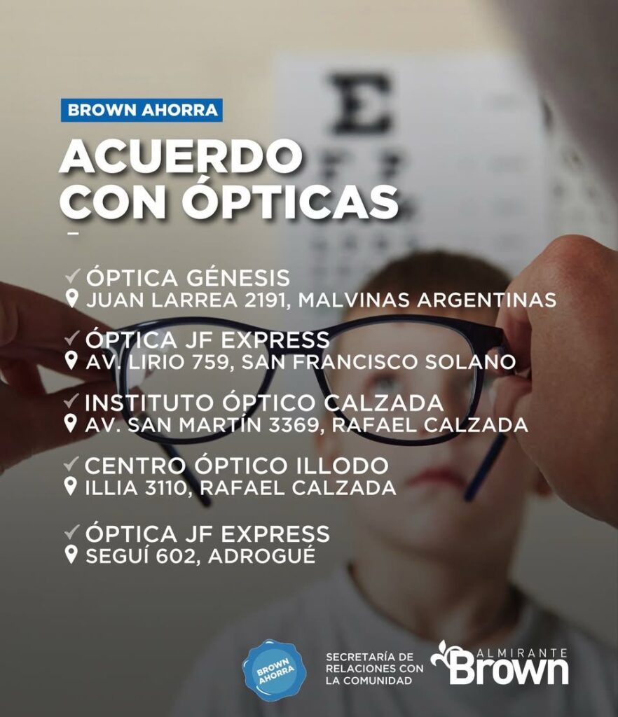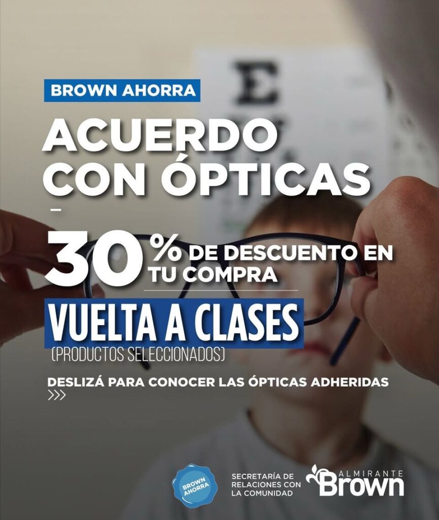 El Municipio de Almirante Brown informó que renovó el acuerdo con distintas ópticas del distrito que permite acceder a un 30 por ciento de descuento en efectivo en la compra de productos seleccionados, en el marco de las acciones impulsadas por la vuelta a clases.