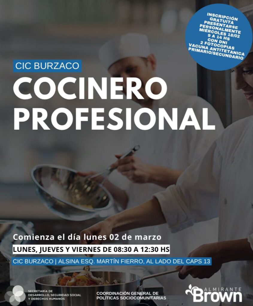 Finalmente, en el CIC de Burzaco (calle Alsina esquina Martín Fierro) se dictarán los cursos de Peluquería y Colorimetría, y Cocinero Profesional, entre otros.