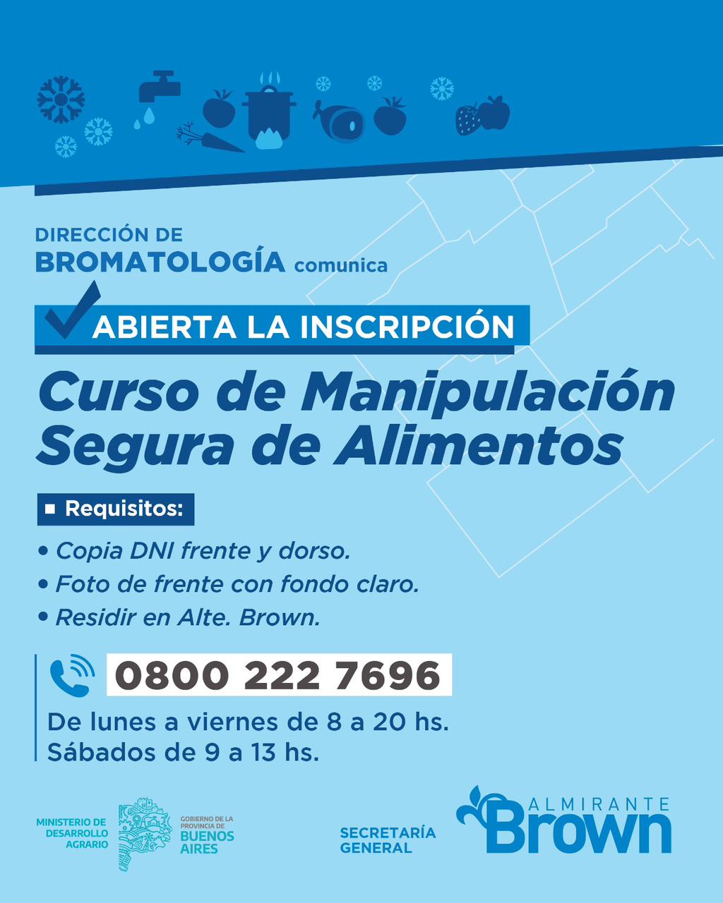 El Municipio de Almirante Brown, a través de la Dirección de Bromatología, abrió la inscripción para el curso de Manipulación Segura de Alimentos, destinado a vecinos y vecinas que desarrollen tareas vinculadas a la elaboración, comercialización o manejo de alimentos.
