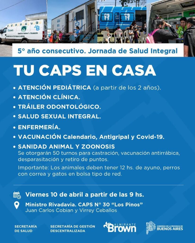 El Municipio de Almirante Brown informó que durante abril el programa “Tu CAPS en Casa” llegará a las localidades de Ministro Rivadavia, Glew y Malvinas Argentinas, acercando distintos servicios de salud a la comunidad en su quinto año consecutivo.
