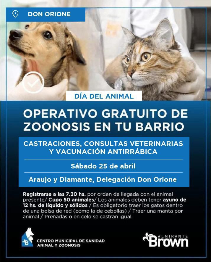 El Municipio de Almirante Brown informó que en el marco del Día del Animal este sábado 25 de abril se llevará adelante en el barrio Don Orione un nuevo operativo gratuito de Zoonosis que incluirá la castración, la atención veterinaria y la vacunación antirrábica de perros y gatos.