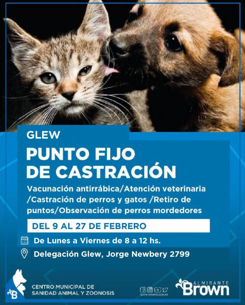 El Municipio de Almirante Brown, a través del equipo de profesionales veterinarios del Centro de Sanidad Animal y Zoonosis, informó que durante el mes de febrero funciona en la localidad de Glew el Punto Fijo de Castración, con distintos servicios gratuitos de salud animal.
